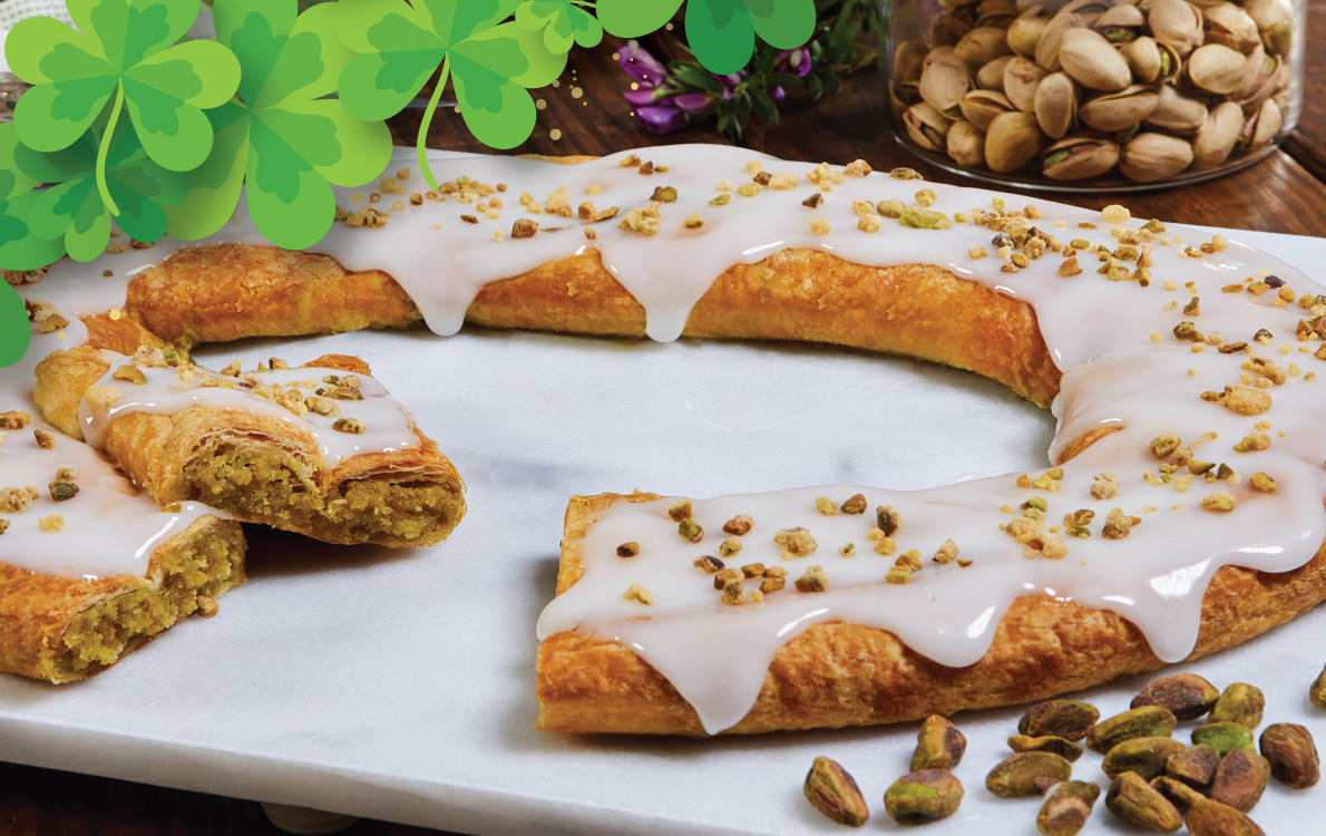 Our Pistachio Kringle is a flaky Danish pastry layered with smooth pistachio filling, topped with vanilla icing and candied pistachios. A sweet way to celebrate St. Patrick’s Day.