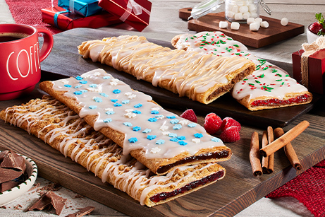 Merry Berry: Ingredients: Bleached Wheat Flour, Margarine (Soybean Oil, Hydrogenated Soybean Oil, Water, Mono- and diglycerides, Soy Lecithin, Sodium Benzoate (preservative), Artificial Flavor, Beta Carotene (color), Vitamin A Palmitate.), Brown Sugar (Sugar, Molasses, Corn Syrup), Sugar, High Fructose Corn Syrup, Blueberries, Cranberries, Cherries, Blackberries, Strawberries, Contains 2% or Less of the Following: Eggs, Raspberries, Modified Food Starch, Corn Syrup, Yeast, Salt, Dextrose, Citric Acid, Soy Flour, Natural & Artificial Flavors (milk), Xanthan Gum, Glycerine, Corn Syrup Solids, Egg Whites, Agar-Agar, Egg Yolk with Added Whole Egg Solids, Guar Gum, Sodium Bicarbonate, Preservatives (Tocopherols, Calcium Propionate, Sodium Benzoate, Sodium Propionate, Potassium Sorbate), Corn Starch, Cinnamon, Malted Barley, Oats, Color Added.